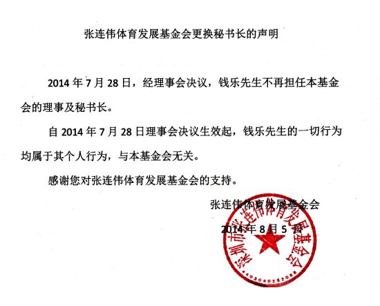 张连伟体育发展基金会更换秘书长的声明