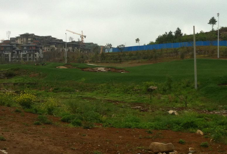 记者发现,高尔夫球场的一端紧挨近百栋高档别墅区,别墅区分为两大块区域,最近临的高尔夫的是已建成的别墅区。这里别墅已进行了外装。稍远的左侧别墅区规模很大,正在进行施工建设中。沿着坡地和树林一条水泥甬路蜿蜒数公里,隐秘于高尔夫球场边。小贺介绍这是球童车道。中铁生态城高尔夫球场的另一端延伸到谷远村背后的山坳间。在一处高尔夫建设工地,一陆姓工人向记者透露,“这是54洞高尔夫球场,有的地已经可以打球了呢。”
