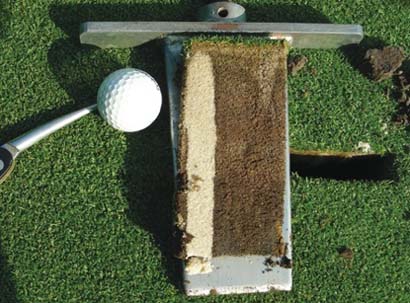 图1 如果果岭建造不成功或管理不恰当,那么将需要大量的管理措施才能取得良好的效果。在这种情况下,为了改善内部排水就需要使用排水性能好的基质并对深层土壤进行改良。 短期目标和长期目标 绝大多数高尔夫球场的首要短期目标是营造良好的草坪球感,但是也要考虑美感和可靠性。如果草坪的质量不能维持那么片面的追求打球球感便不再那么重要了。果岭可以在温和的天气下表现良好,但是环境胁迫加强之后就发生恶化,那么这种养护计划就是不切实际的。在美国大多数的地区,天气周期性的剧烈变化可以对草坪产生严重的影响,从而引发威胁草坪健康的虫害和病害,所以保持草坪良好的球感和稳定的质量是至关重要的。因此,要协调好短期内追求良好的球感和长期保持稳定的生长质量之间的关系。