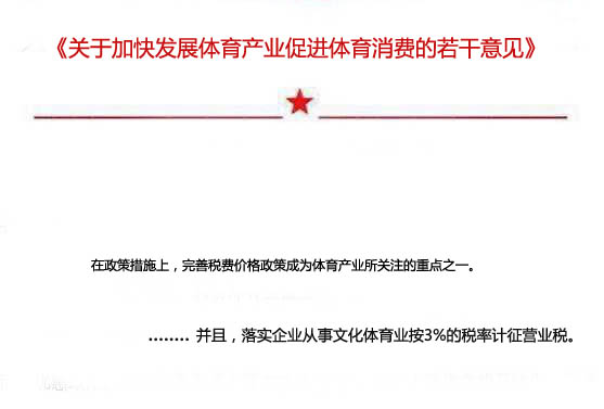 “文化体育业按3%的税率计征营业税,是一个很大的突破。”业内人士说说,以前如高尔夫、台球等放到娱乐业中,均按娱乐业标准征税,税费相对较高。目前文化体育产业享受到这一扶持政策,将提升其发展动力。