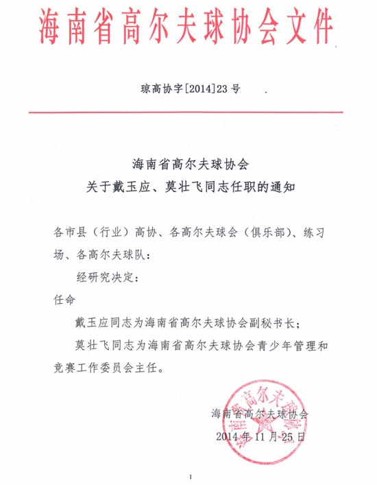 海南省高尔夫球协会关于戴玉应与莫壮飞任职通知