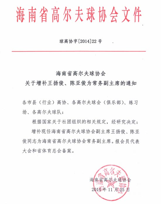 海南省高尔夫球协会关于增补常务副主席的通知
