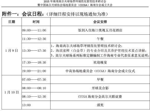 一、会议主题:“2015年海南高尔夫球场草坪规范化管理技术研讨会”“暨中国高尔夫球协会场地委员会(CCCGA)海南分会成立大会”