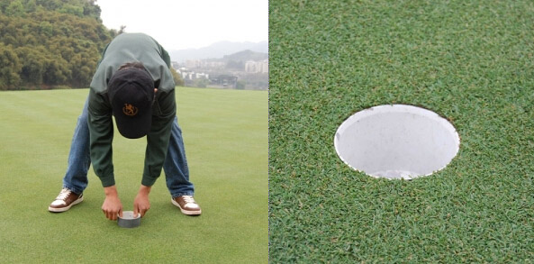 1. 根据果岭表面造型、大小确定新洞位置,与旧洞位相隔距离不能小于3码。洞杯更换位置呈S形分布,不能呈直线分布,以保护草坪不受重复践踏。测量新洞位周围1码范围内果岭表面坡度不大于2度,并确定草坪完好无损,再进行下一步工作。