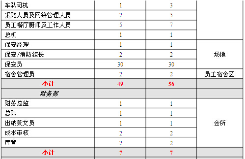 中国18洞及27洞高尔夫球会, 工作人员编制上,大致如下: