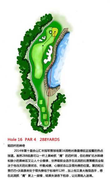 4、赛事型球场的球道要有戏剧性,,要给突发事件的可能性留下设计伏笔。突发事件的球道在设计上会显得怪异,比如有大的转折,大的狗腿,以及攻击果岭的捷径。这就是对地形的要求很高,在设计中要体现出冒险与回报的精神。球场的设计要充满诱惑,刺激球手大胆进攻而取得冒险的回报,这就要求在设计上体现出很多抓鸟机会的洞如:五杆洞两杆上果岭的大狗腿、四杆洞的一杆上果岭(例如佘山高尔夫球会的16号洞,这是一个只有288码的4杆洞,职业球手们在这里非常有机会一杆攻上果岭,捉鸟射鹰),这都会让球手们跃跃欲试,增加比赛看点,也会让赛事更转折。从这一点上来说,太过平庸的设计、直线的设计,以及障碍设计做得不够巧妙,都不适合做赛事型球场。