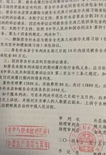 吉林延吉公园高尔夫练习场裁定书