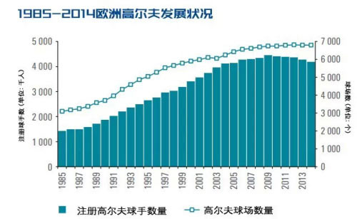 在1985-2010年间,欧洲的高尔夫市场一直保持着稳定的增长,而受到全球金融危机的影响,高尔夫的参与度以及球场的数字都在2010年起逐年下滑,下降幅度在2013年达到峰值,并在2014年有所缓和。