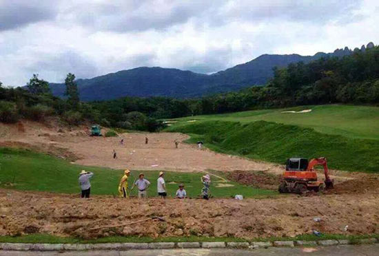 北京时间6月16日消息, 据网友爆料:海南海垦七仙岭国际高尔夫球会在近期被铲,而且从网友晒出的现场照片可以看出球场的果岭已经被推平,不少工人正在球场施工。