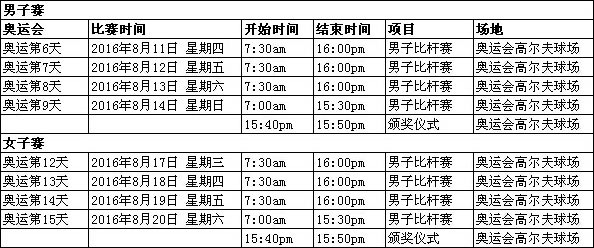 据奥运会高尔夫比赛时间表显示,本届夏季奥运会男子高尔夫项目将于8月11日开始,前三轮每天早晨7:30分开赛,下午16:00结束,每天直播时间达到了8个半小时。