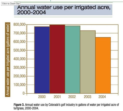 总的用水量自2000年至2003年都趋于稳定,但2004年的时候整个行业的用水量有了17%的降幅。而每英亩的灌溉量也在2004年的时候有所下降,自2003年的72.9231万加仑/英亩(682.12万升/公顷)下降至65.1295万加仑/英亩(609.22万升/公顷),降幅达11%。