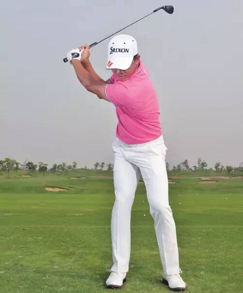 比如说要打出比全挥杆要短的距离时,我会将杆面稍微打开,而其余的握杆、上杆幅度和速度都保持不变,这样除了能实现需要的距离,还能使打出的弹道较高,在果岭上到停球效果。不过在采用这种方法控制距离时,需要在站位时将球位相对正常位置往左调整半颗球,因为杆面在相对正常角度打开以后,下杆回正的点位会相对偏左一些。