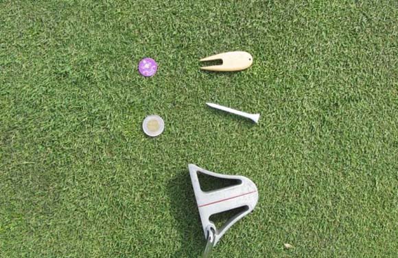 4.在果岭上划线来标定球位。这是不被鼓励的做法,因为可能损伤果岭,并且有可能会违规(测试果岭或指示推击线)。