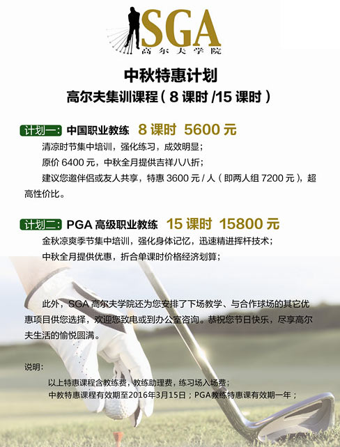 金秋凉爽时节,正值中秋来临之际,SGA高尔夫学院朝阳培训中心特别推出节日特惠课。