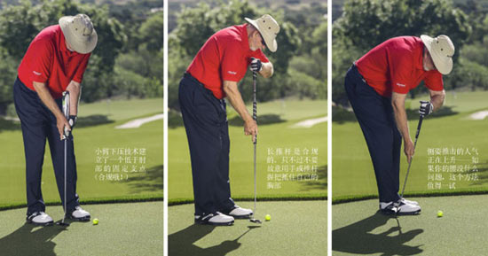 USGA规定不准使用支点式推击,并不意味着就要把你的长推杆束之高阁。照常使用——只是不要故意把手或是握把支在胸部,也不要用左小臂制造支点。取而代之,让握杆时离握把顶端较近的那只手离开自己的身体,直到推杆整体呈现垂直状态,同时,杆头跟部稍稍离开地面(见下中图)。尽管你的固定支点没了,但仍可以用这种方法打出上杆笔直、触球稳定的推击。