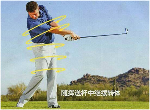 这时右肩应转向下巴下面,与上杆动作的左肩是对称运动。通过重心转移,右臂与球杆一起挥向球飞出去的方向,这就是充分的动杆动作。之后,通过身体及肩部转动的弹性自然地完成收杆动作。