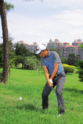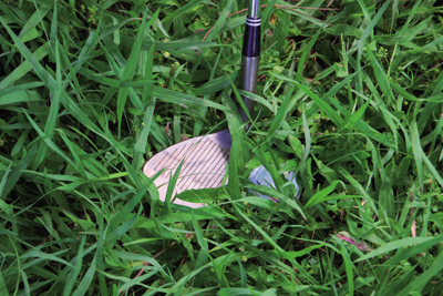 春雨绵绵,球场上粗草区的草总长得特别快,所以当球友错失果岭时,较容易面对深粗草区球位。当球整个被草叶覆盖,上果岭又没有足够的落球空间时,唯一能靠近旗竿的打法,就是高抛球了。