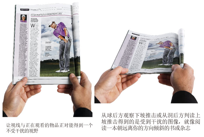 对于“从洞后方还是球后方判读果岭”这个问题的争论一直很激烈。我认为答案很简单:看情况。为了让你的双眼能准确评估距离和坡度,不同的推击需要不同的判读视角。简单的指导是: 请注意,两种情况都是从较低的一边判读果岭。当蹲在低位观察时,你的视线正对(或接近正对)着斜坡,因此你是迎着斜坡而不是顺坡看。 有区别吗?可以拿一本书或杂志,让它顺着你的视线倾斜,然后试着阅读。根本不可能看清楚,因为字是模糊的,而且页面上的图像看上去是朝着一个透视点聚拢,就像向远方延伸的铁轨。当你从果岭较高一边判读推击也会出现同样的视觉干扰;从高处顺坡观察果岭就像读一本倾斜的书,球和洞之间的距离看上去比实际更长。像阅读杂志那样判读推击——让果岭展现在你的面前。如今很多与果岭判读相关的指导是以科学为依据,而我这条建议纯属生活常识。 图)。 估算距离时用合适的速度从球位到洞杯挥动杆头,这能在实际推击时帮助你的大脑以正确的力度移动双臂和推杆。是的,你也可以简单地用双眼扫过这条路线,但研究证明通过眼、手配合比只用双眼更能提升大脑效能。此文章来源于网络, 版权归原作者所有。