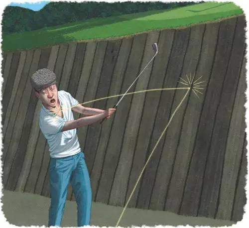 规则先生:虽然不常见,但这是真的:我的球落在了一个很深的沙坑里,四周是支撑铁轨的一堵墙。我试图脱困,但打了剃头球,球撞到枕木弹回来,打到我的胸然后落进了上衣口袋里。