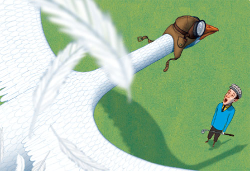 解答:嘿,天上飞过的大雁送出的大礼,可能会比一片羽毛糟糕得多。一般来说,按照规则19-1,当运动中的球被局外者变向或停止,需在球的现有位置打球,不必受罚。但由于这一杆是在果岭上,而且这片羽毛的飘落停止或改变了球的运动,那么该次击球应被取消,并须将球放回原位,重新击球。