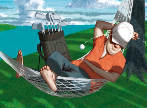 解答:小费就别给现金了,给球童一个建议吧:集中注意力,哥们儿!你的同伴并非有很多选择,但他在这洞结束前换了一个新球,这肯定是不行的。根据规则15-2,未经允许替换球的处罚是:比洞赛——该洞负,比杆赛——罚两杆。或者,他可以像伍迪·奥斯汀那样,继续打那枚现在正与鱼共寝的球。