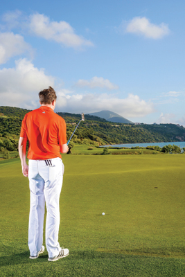 和高尔夫运动的其他部分相比,推杆无疑是最个人化的技巧。你应该听过那些全世界最顶尖的推杆好手,被冠上「感觉」型或者「理论」型球员,但事实上你根本不清楚这怎么区分、或者你自己是属于哪一种。很简单,这从你的判读果岭方式就能一窥端倪。两位名列本刊百大名师的教练Steve Astle与David Brooks,都是果岭上的箇中好手;不过,他们俩人的推杆预击流程与方式却大相迳庭。在Costa Navarino高尔夫俱乐部的海湾球场(Bay Course)相当困难的第四洞果岭上,我们要他们两人面对一记相同的推杆,并且说明他们各自的推杆模式为何。