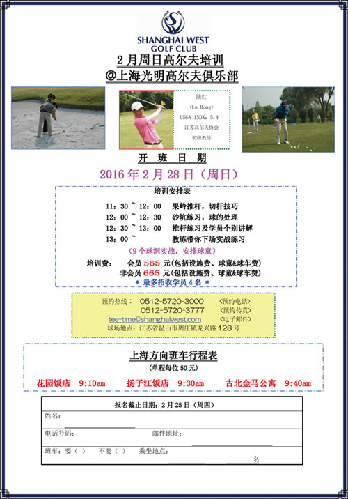 2016年上海光明高尔夫2月周日教程安排