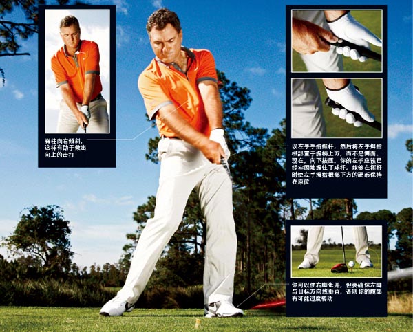 不要只是将头部转至球后方,应使你的整个上体转至球后方。你应该感觉脊柱底端指向球前方,右肩明显低于左肩。这样有助于做出向上的击打,从而增加开球距离。