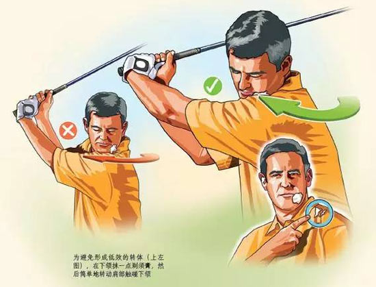 想让开球再远10到15码吗?在左侧下颌抹一点剃须膏,并采取通常的预备站位,然后充分转体上杆,保持上杆顶点姿势一到两秒钟。试着让前侧肩转过并直接触碰下颌。