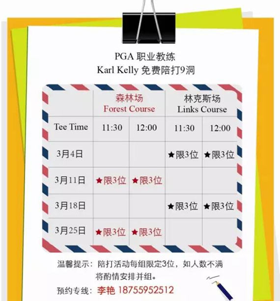 周三会员高尔夫课堂俱乐部将每周三定为会员高尔夫课堂免费体验日。当天10:00-16:00期间,可预约免费高尔夫教学体验1小时,每位会员限免费体验1次,请提前预约哦~