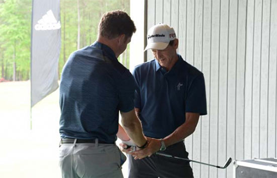 我采用的是双手十指交扣的握姿,但Haney提示我在击球准备姿势时,左手需要多用点力。同时,他还指出,左手拇指需要滑入右手掌褶皱处。