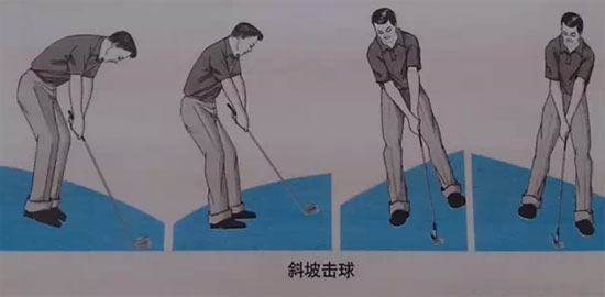 打球时,不能每一个球位都在平坦之处,相反斜坡击球的情况更多。斜坡击球重要的是保持身体的平衡,如何利用好膝部的弹力是关键。另外,肩部和腰部与斜面保持平行是斜面击球的原则。一般斜坡击球出现失误是因为没有采取与斜面相对应的站位。