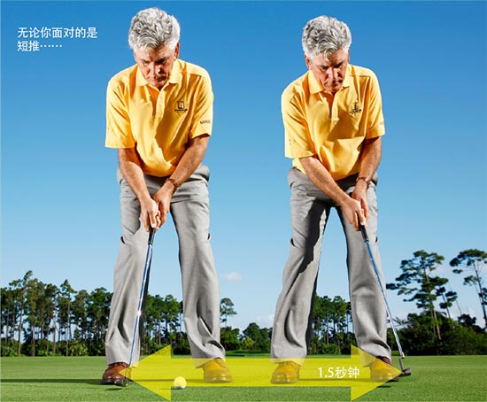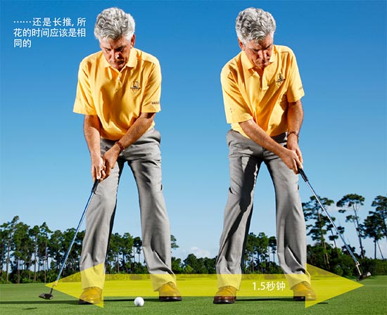 世界上最优秀的推击者们在推击时有着稳定的节奏。有了稳定的节奏,施加在球上的力就是稳定的,结果就是可以稳定地控制击球距离。当一位职业球员推击失误时,问题往往在于研读果岭,很少在于距离控制。
