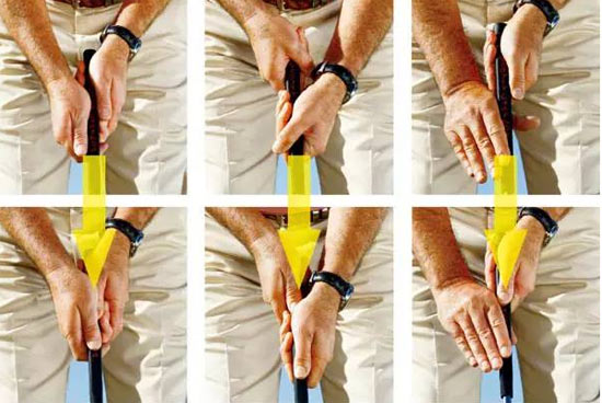 我猜你正为自己的推击焦虑——或者为推击错失球洞之后面临的回推担心,却很少或根本没有考虑过你的握杆。你只需简单地将双手围在握把上然后推击。你或许在想:“像推击这样又慢又短的动作,握杆又能起多大作用?”告诉你,作用大极了。