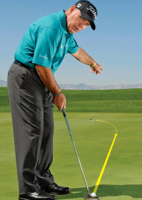 把每一次推杆都当成是推向拐点的直线推杆。如图所示,我面对的是一记20英尺推杆,拐线大概3英尺左右。所以球推出去的方向偏离洞杯方向3英尺。拐点是我的关注点。只要我能将球推向拐点,剩下的就交给斜坡完成。我喜欢想象球前有一个6英寸长的木条指向拐点。让球沿着木条滚出去,球就能够按照合理的线路滚出去。