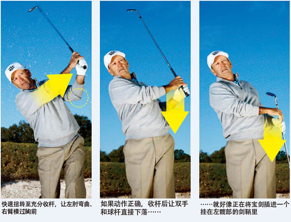 你的球落在了深沙坑靠近前缘的地方。你必须打出几乎直上冲天的高飞球,否则球将会落在沙坑面上,然后弹回沙坑。你开始挥杆,在随挥时将球杆高高举起,以为这能让球向上浮起飞出沙坑。但结果并非如此。你的球仍在沙坑里。为什么?当你在触球之后抬起球杆时会降低挥杆速度,而挥杆速度正是打出高发射角(适合深沙坑)和额外球旋(适合任何沙坑)的关键。