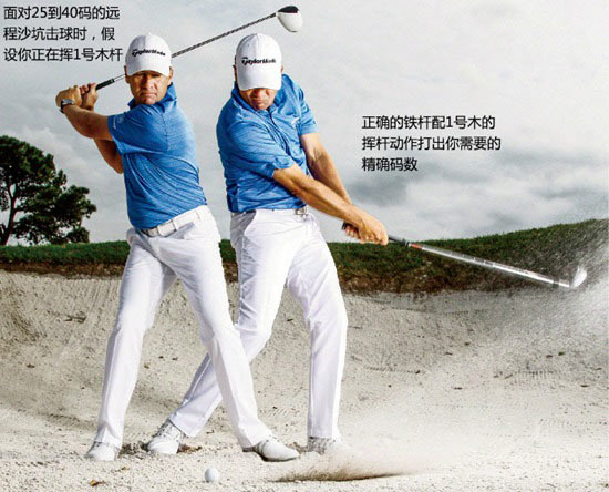 果岭边沙坑击球相对容易些——只需选择沙坑杆,用简单的挥杆让球杆从沙子中穿过、平稳地让球弹出。然而,从离果岭更远的沙坑击球时却困难重重。知道吗,即使美巡赛球员也认为距离果岭25到40码的沙坑球是最难的高尔夫击球之一。如果你像大多数业余球员一样,这种情况下你常常不是击球过短,就是将球打薄落在意想不到的地方。