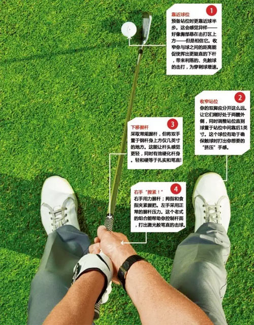 右手用力握杆;拇指和食指夹紧握把。左手采用正常的握杆压力。这个老式的组合能帮助你控制杆面,打出激光般笔直的击球。