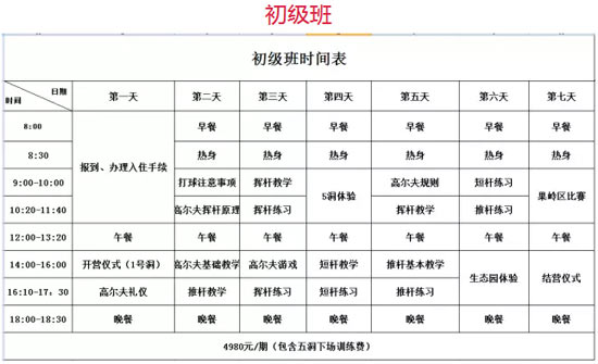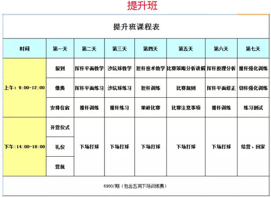 (1)为期7天的封闭式训练,以巩固挥杆平面和短杆、推杆为主。从握杆、瞄球、站姿、站位的讲解和修正,半挥杆和全挥杆、切杆的训练使学员在短期内快速提升球技。