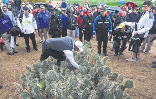 规则判例1-2/10:当球位附近有自然生长的仙人球时,为避免意外,可以用毛巾或其他物品包裹自己的身体部位,而不必受罚。但如果遮盖仙人球,根据规则1-2中“不得有意影响一洞的比赛而改变自然条件”的规定,该球员将面临:比洞赛——该洞负,比杆赛——罚2杆的处罚。不光是仙人球,仙人掌、荆棘,甚至迷人的玫瑰等等,都是“自然条件”的组成部分。因此,不要招惹那些花花草草,还是让自己武装到牙齿吧。
