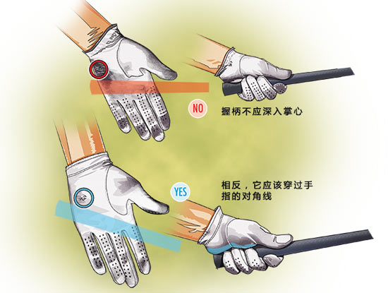 如果你的握杆动作正确,主要以手指握杆,手套底端应该只有一小块磨痕。以手指握杆越多,手腕越容易上翘以及由上翘恢复平直,从而增加击球力量。握杆时,确保球杆穿过手指的对角线,拇指根部处于握柄顶端,4指指尖轻触掌心。