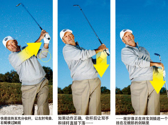 把深沙坑击球看成只是另一次在球道的挥杆。采取正常的预备站位,杆面和站位略微开放,球置于中心略微靠前一点。然后进行肩部充分扭转的全挥上杆。下杆时对准球后部(准确地说是球后两英寸的一个点)用力击打——就像攻果岭击球那样——让位于球后和下面的沙子飞溅出沙坑。转体进入收杆姿势,左肘弯曲、右臂横过胸前。这个转体动作是深沙坑救球的秘诀,提供打出高发射角所需的杆头速度。如果动作正确,收杆后你可以让双臂下落,将挖起杆插进一个想象的挂在左髋部上的剑鞘里(下图)。我会对学员说:让宝剑入鞘!这个动作不仅奏效,还让你在挥杆结束时显得很酷。
