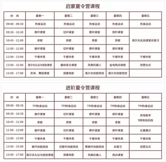 费用包含:专业青少年高尔夫教学;器材及室内外场地设施使用;午餐及茶歇; 击球训练。
