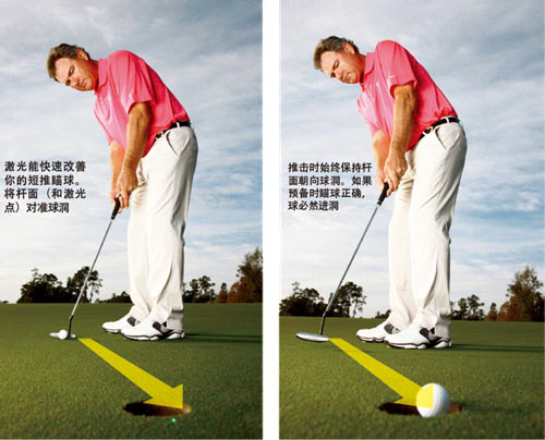 当你错失短推时,说明你的推杆在预备击球时没有瞄准球洞(或者洞口边较高的一侧,如果是球路弯转的推击)。挥杆的小毛病或许对短推影响不大,但瞄球必须完美。为了改善瞄球,可以买一支激光发射器(一般的高尔夫用品商店都有售,我用的是能安装在推杆上的一种)。把它安在你的球杆上,然后找一个直的4 英尺推击预备站位。激光点会显示你的瞄准是太靠左还是太靠右,或者正对目标(下左图)。