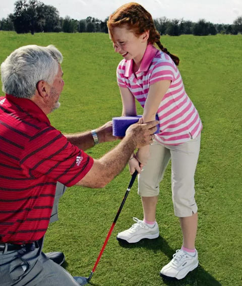 我不会让小孩用那些专门的挥杆辅助练习器材来学习挥杆,而是找一些废旧的海绵。在双臂或者双膝之间夹住一块大海绵可以帮助他们找到挥杆的感觉。放在双臂之间,可以让手臂的动作协调一致;放在双膝之间,可以让下半身更加稳定。如上图所示,我会让孩子们在收杆时尽量挤压膝关节之间的海绵,来保证身体重心完全转移到左侧。他们也没有必要从开始就配上一套完整的装备。如果孩子开始要求换球杆了,那就说明他们爱上高尔夫了。