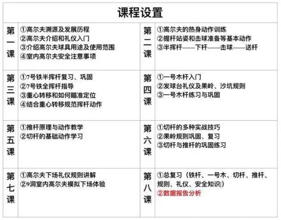【课程内容】高尔夫简介及礼仪入门、铁杆,一号木,切杆,推杆等的动作教学、高尔夫下场礼仪及规则等。