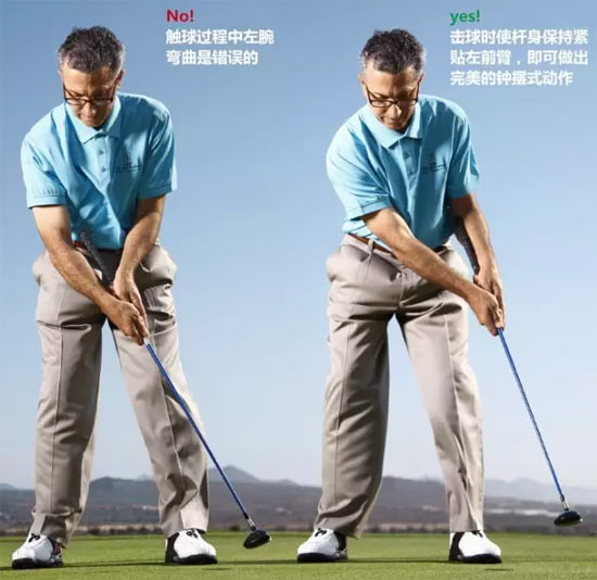 下杆,触球,做顺势动作,收杆。球杆握柄仍然应该保持紧贴左前臂,杆身和左前臂处于一条直线上。反复练习,它能够使你体会到完美的钟摆式动作的感觉,使你在触球过程中让左腕保持平直,这是稳固推击的两个关键。
