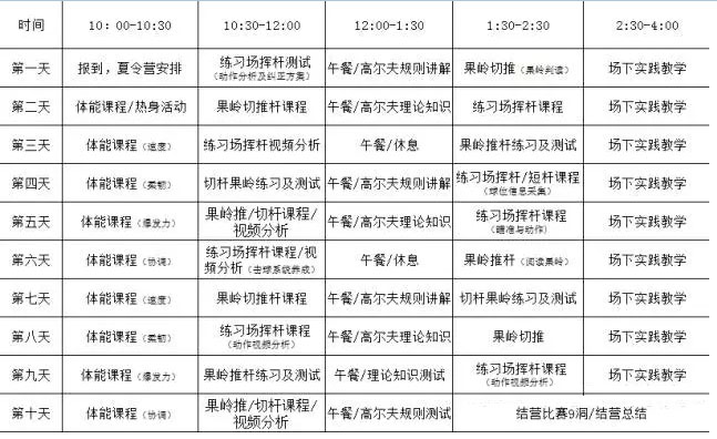 (费用包括教练、体能训练、练习场训练、练习果岭练习、每日下场训练、球童小费、外教口语授课、营养午餐、新鲜水果、集训营纪念品、奖品)