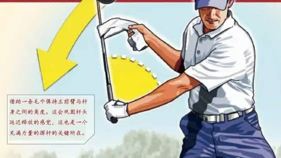 做一些半挥杆,在触球之前停住;使毛巾一直处于紧绷的状态,这样你就能保持住左腕的立腕和左前臂与杆身之间的角度。继续半挥杆训练,直到你可以感受到杆头的延迟释放,此外你的身体也要有相应的移动来制造这个力量角度。