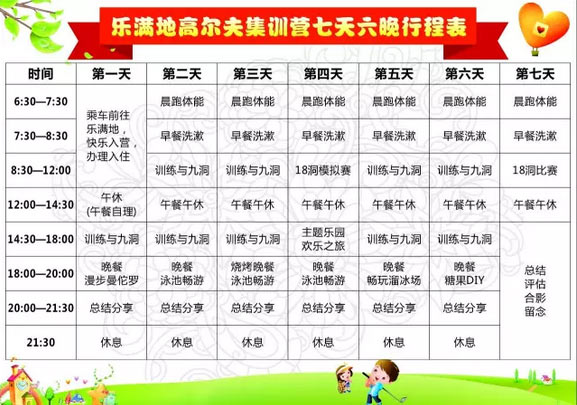 乐满地高尔夫集训营,70%实践+30%理论是打造高尔夫集训营黄金课程的全新概念,旨在通过团体训练的方式,帮助青少年提高下场实践作战能力,并针对学员培养高尔夫兴趣以及独立生活能力和人际交往的能力。球场优美的环境和良好的训练条件可以让孩子们在这里了解这项运动,培养更多兴趣。